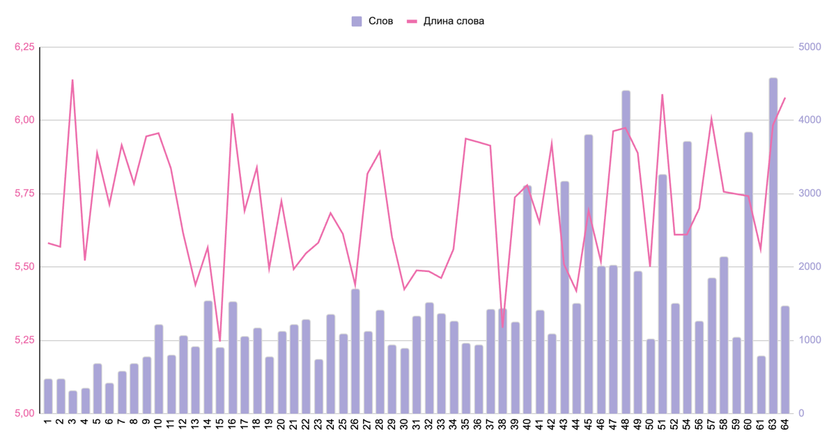- Всего около 90000 слов, 600000 знаков с пробелами, 520000 знаков без пробелов. Что даёт нам среднюю длину слова — 5,78