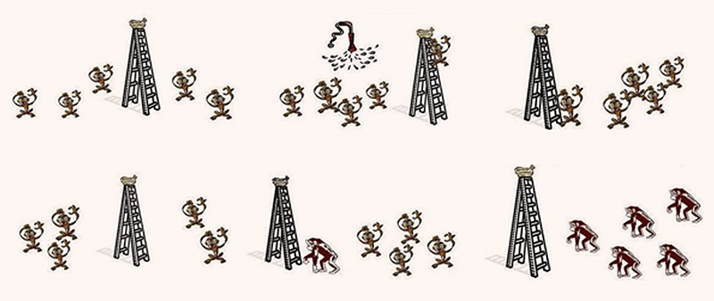 В клетке живут пять обезьян. К потолку подвязана связка бананов, под ними стоит лестница. Когда одна из обезьян пытается подняться по лестнице за бананами, всех обезьян обливают ледяной водой. Каждый раз, когда другая обезьяна пытается добраться до бананов, случается то же самое. Спустя время, если какая-то обезьяна пытается залезть на лестницу, остальные её останавливают, избегая холодного душа.