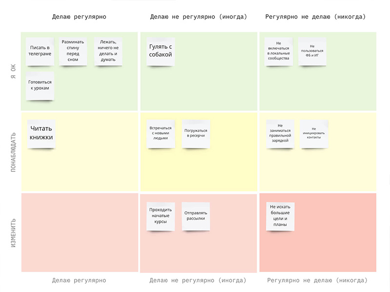 - Три столбца: делаю регулярно, не делаю регулярно, регулярно не делаю.