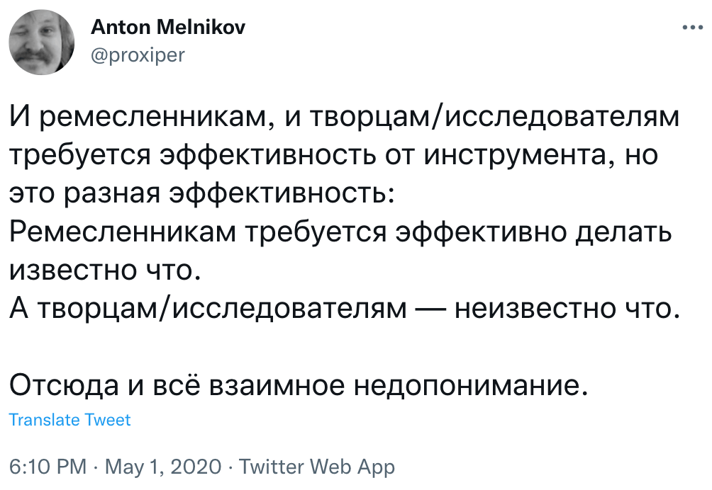 Как я понял: поиск инструментов может подменять саму работу. Придумал задачу, нашел, попробовал, впечатлился, погрузился, обсудил, засомневался, пошел искать что-то еще — и повторить — работать некогда. С другой стороны, мне под рукой вроде как действительно нужен шустрый макбук и большой монитор. С другой стороны, в 8 классе я «прогал» дома в тетрадке и потом набирал программы в школе на убогих по сегодняшним меркам компах — и это был кайф и творчество. Короче, инструмент не виноват, если что-то не ладится.