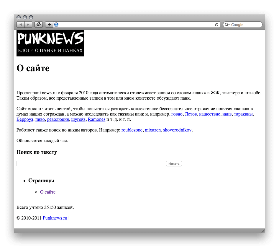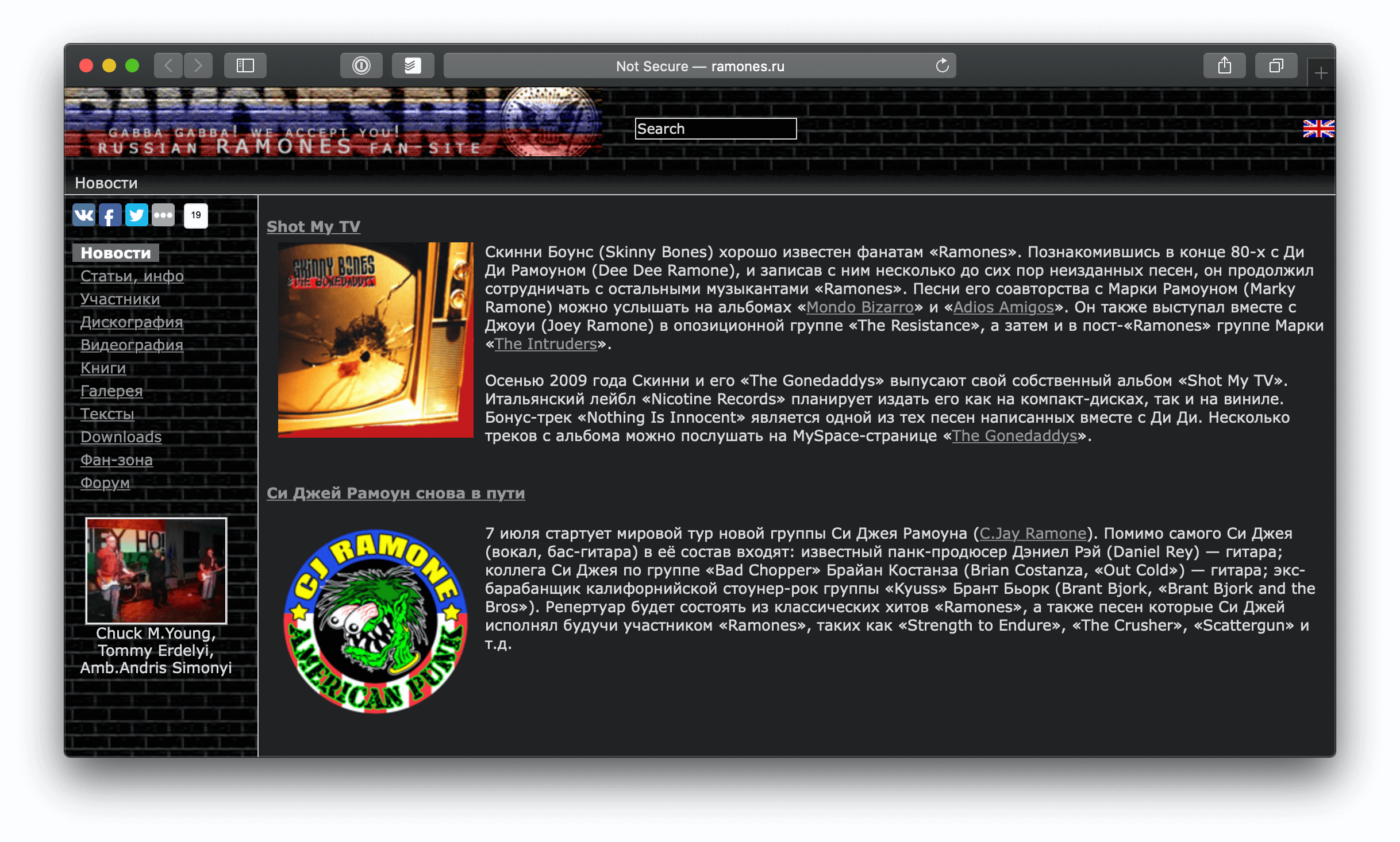 На технологии того самого физтеховского движка была сделана очередная версия самого значимого для меня проекта — ramones.ru. Вместе с Борисом MGL2R перенесли потом все на Джумлу, и сейчас сайт в состоянии зомби. Ramones.ru познакомил с множеством прекрасных людей и доставил много минут веселья.