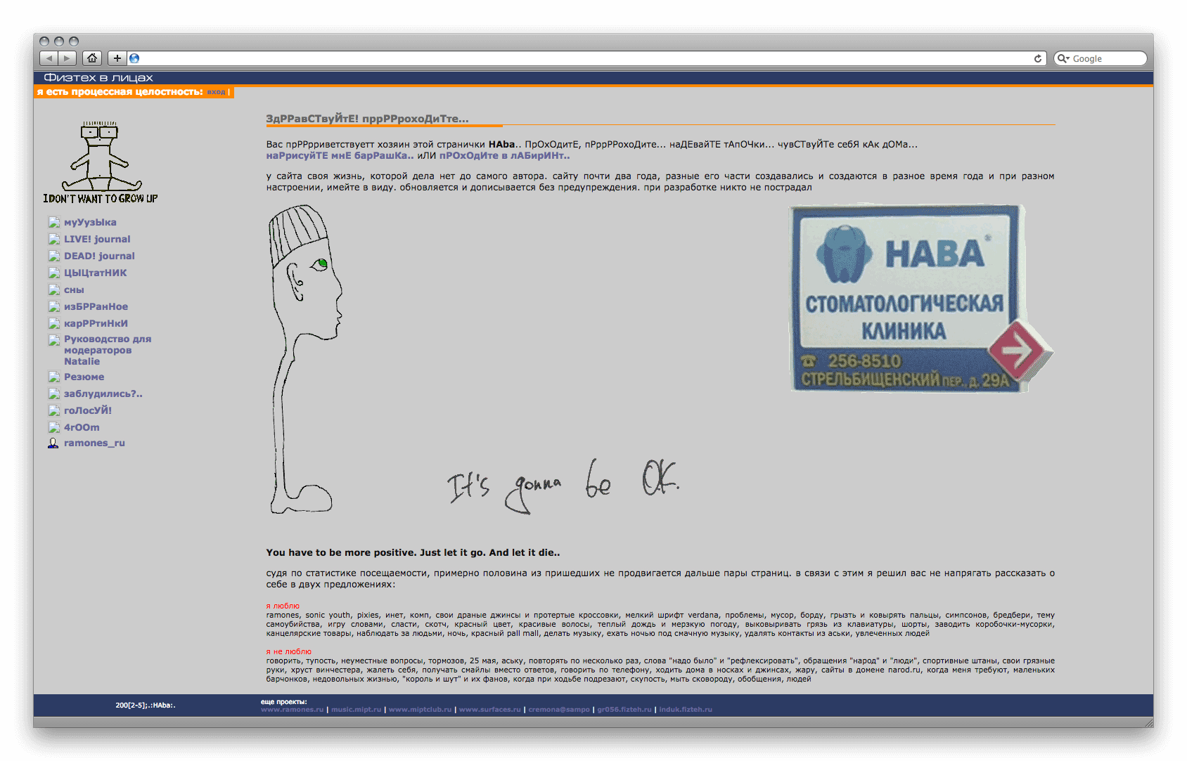 На физтехе изобрели движок, на котором сделали сайт института, сайты факультетов и кафедр. Студентам и группам предлагали делать свои страницы. Ну я и сделал. Коллекционировал там текстовую и графическую дичь, а также писал сам.
