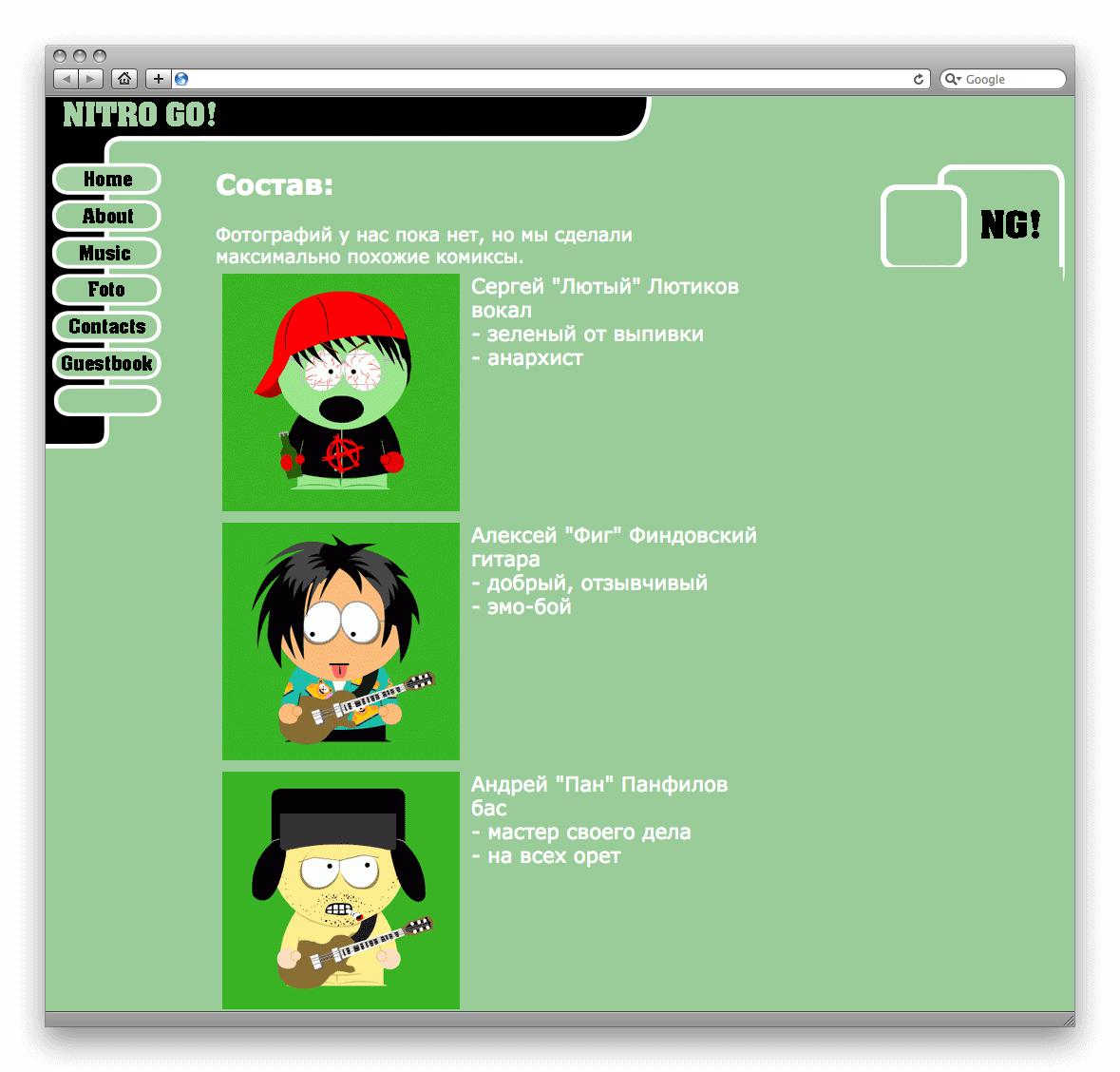 На народ.ру сделал страницу несуществующей панк-рок группы Nitro Go. Написал историю группы, состоявшую из текстовых клише. Вместо фото сгенерировал человечков в духе «Саус парка». Для размещения музыки взял пару треков со сборника балканского панка, где вообще ничего не разобрать.