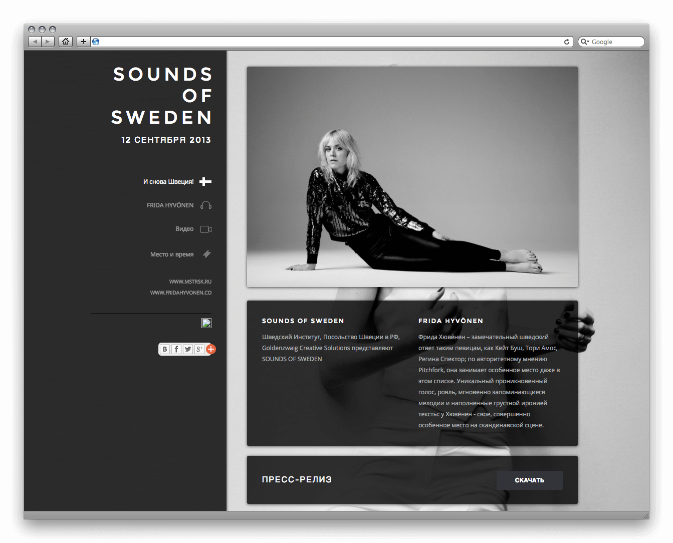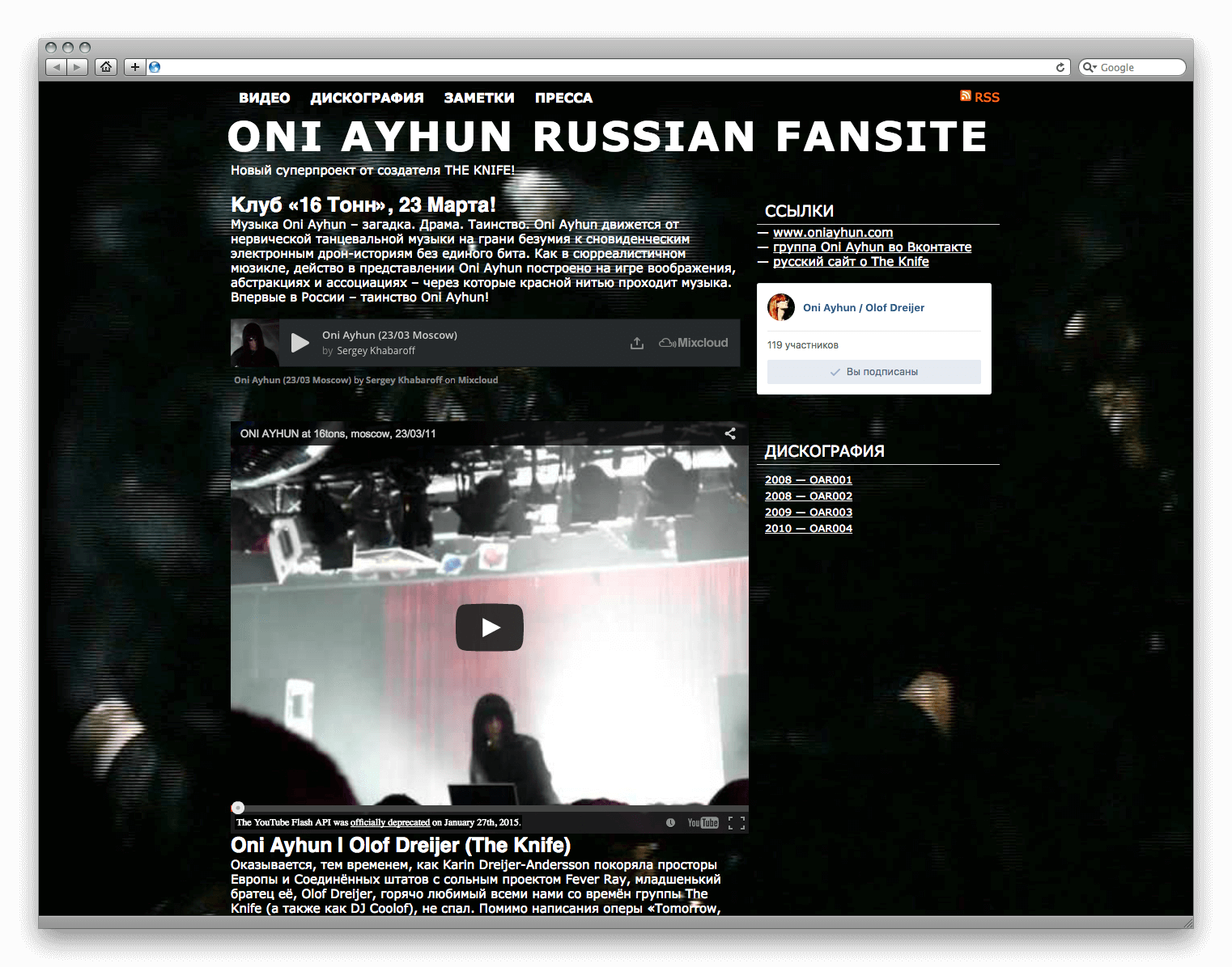 Особенно интересен сайт для концерта Oni Ayhun. В анонсах выступления Oni Ayhun, исходивших от промоутера, нельзя было говорить, что приезжает Олоф Дрейер из The Knife. А как иначе успешно широко анонсировать DJ set некого парня из Швеции? Мы сделали «фэн-сайт», на котором разместили переводы рецензий, отзывы из твиттера, материалы из прессы, и конечно же, пометили «Новый суперпроект от создателя THE KNIFE!» Такая мистификация. Само выступление было прекрасным, записал полный сет на аудио.