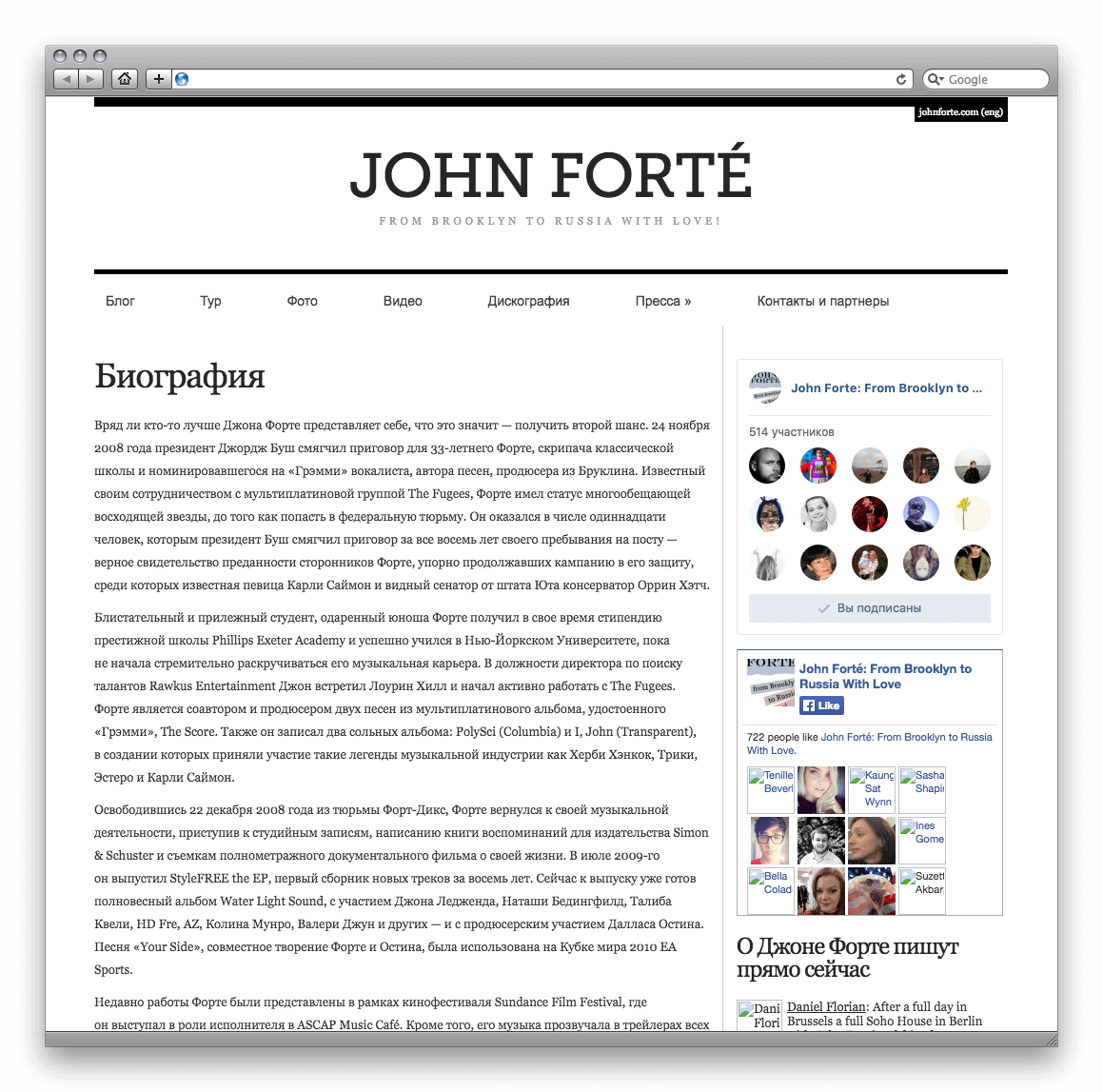 Для поддержки концертов российского тура американского певца и исполнителя делали сайт и вообще все прочие промо штуки от билбордов на улицах до видео. История красивая, Джон душевный. Сайт умер.
