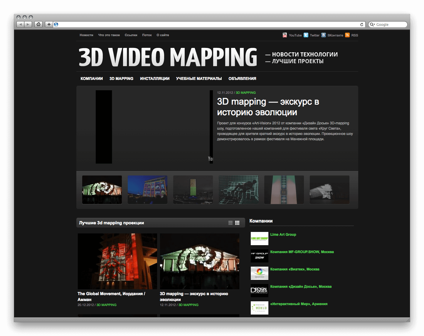 Чтобы продвигать парней, делающих свой лазерный проектор, я решил продвигать категорию световых проекций в целом. Запилил сайт про видео маппинг. Переводил статьи, собирал новости, перезаливал видео в отдельный канал на ютьюбе, оптимизировал для поисковиков, создавал каталог компаний, связывался со световыми художниками, транслировал картинки из инстаграма и твиты по теме. Проект умер.