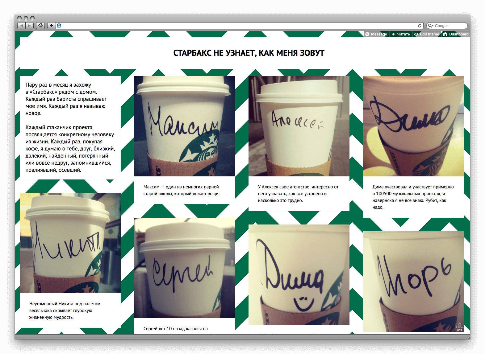 Лиричный проект о благодарности людям. Был период, когда я работал в «Старбаксе» рядом с домом. Каждый раз бариста спрашивал мое имя. Каждый раз я называл новое. Каждый стаканчик проекта посвящался конкретному человеку из жизни. Каждый раз, покупая кофе, я думал близких, далеких, найденных, потерянных, запомнившихся, повлиявших, осевших людях.