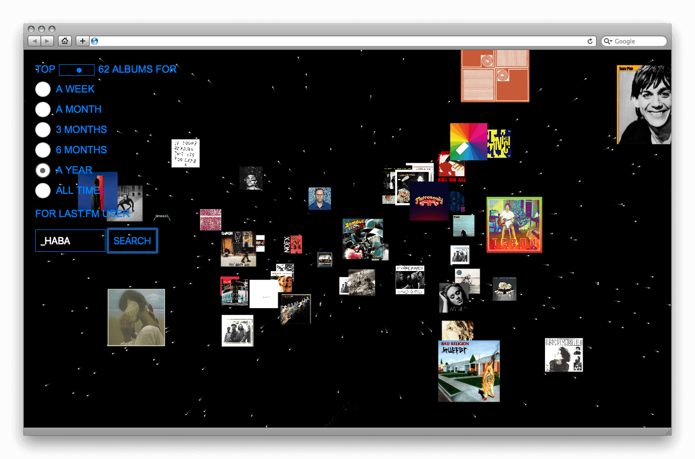 Статистика прослушиваний альбомов на Last. fm, оформленная летающими обложками. Тренировка работы с API и шерингами.