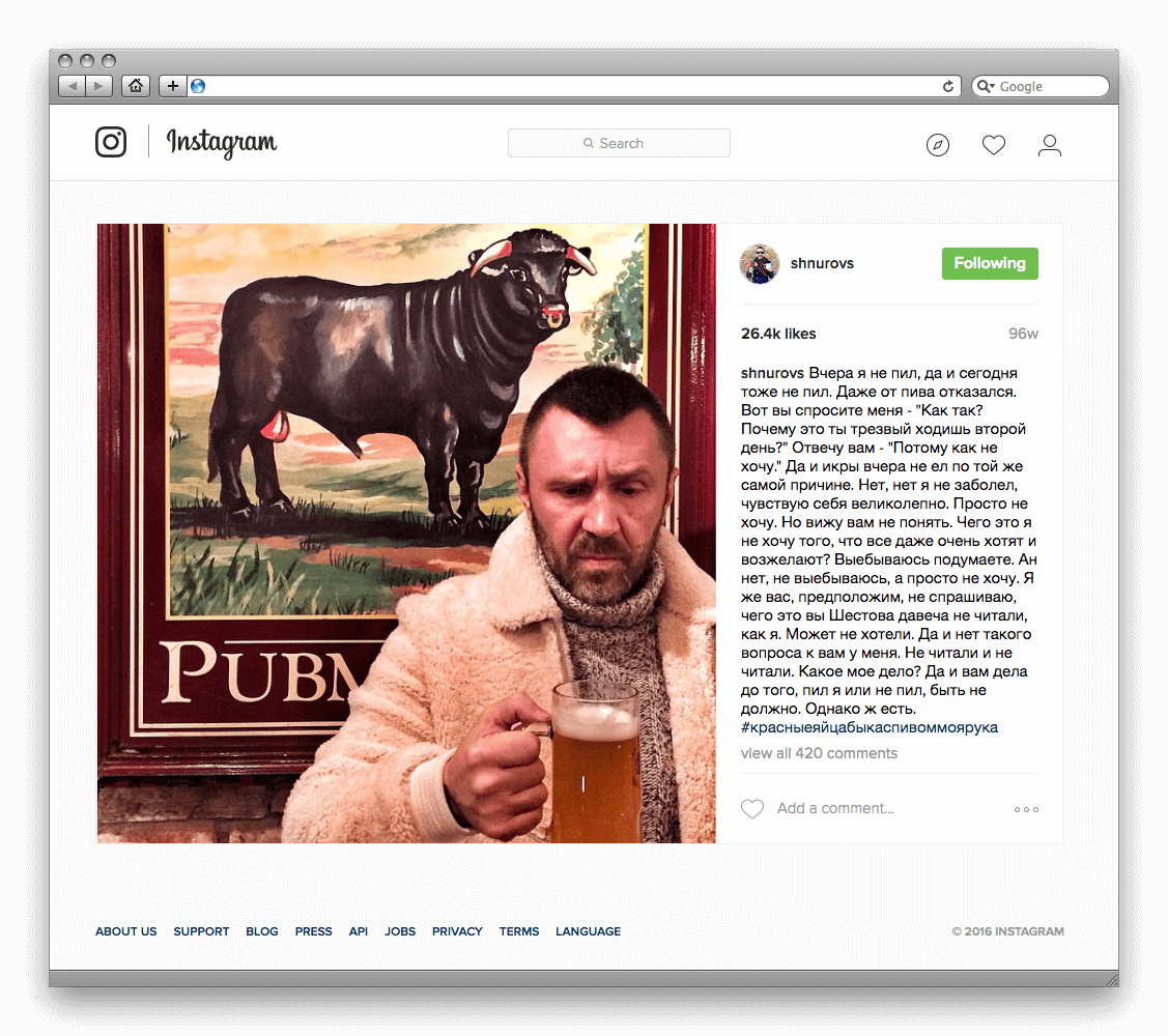 Звезды используют инстаграмы в качестве блогов. Нужен агрегатор текстовой информации и высказываниями, иначе все тексты есть только в инстаграме. Можно было бы делать определенные срезы по тегам, кто из наших поп звезд о чем думает. См. «Суперпозиция Шнура», «Второй эшелон», «Самый нелепый шоубиз раздрай года». Ссылки хранятся аж с 2014, хаха.