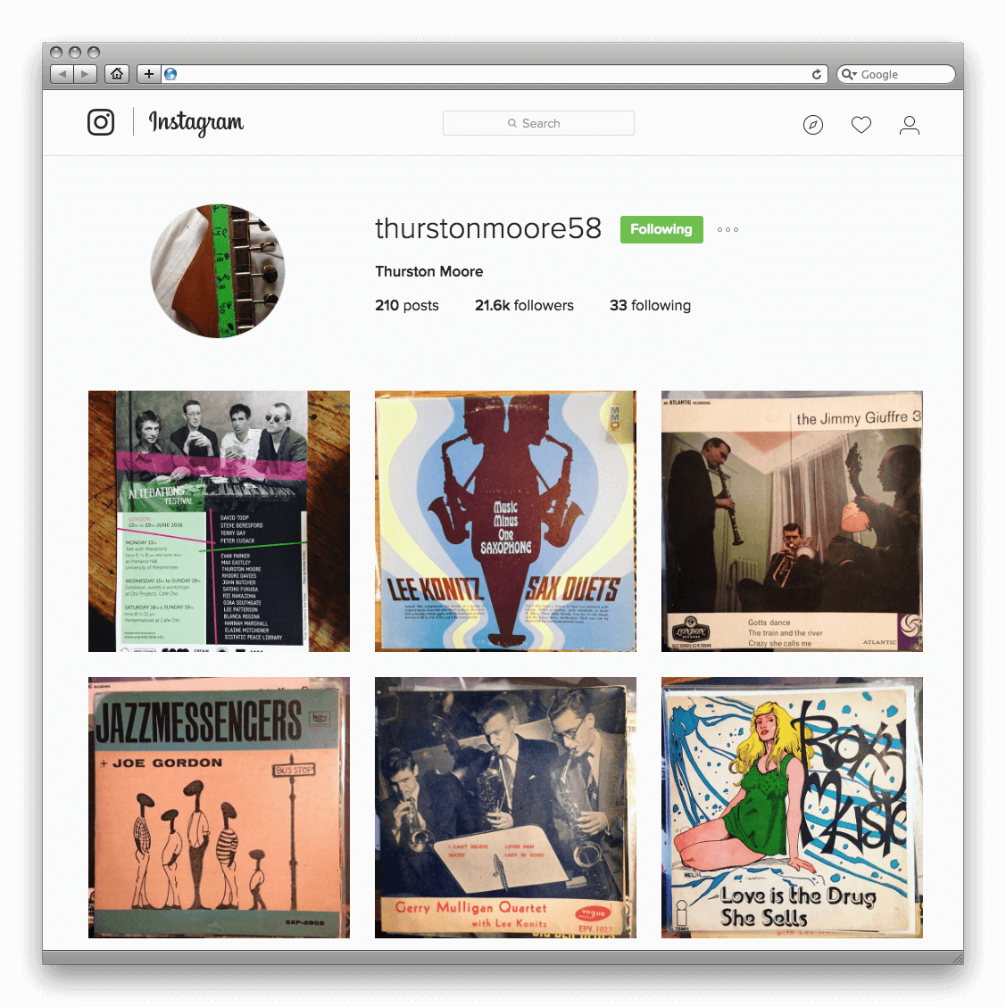 В инстаграме Торстона появляются фото обложек пластинок и дисков, которые можно опознать и слушать.